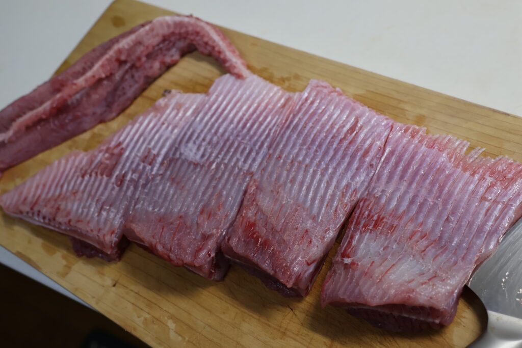 とりあえず適量をぶつ切りにしてみます。ヒレの外側に向かって筋状に見えるのが軟骨部分で、この隙間に包丁を入れればサクッと切れます。
