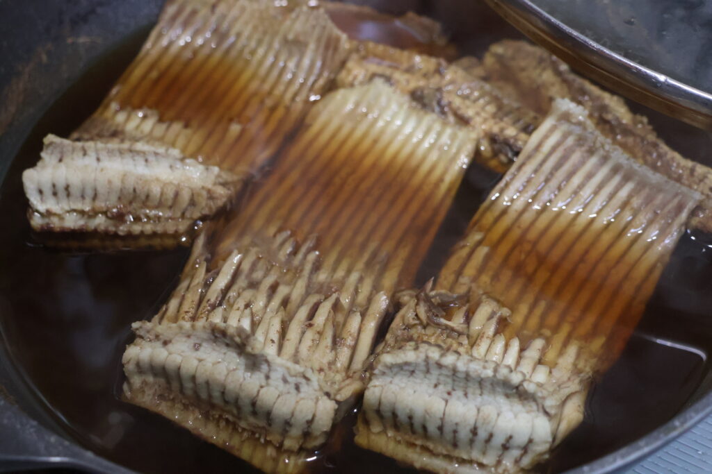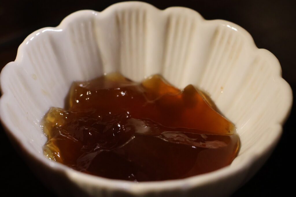 ちなみに冷蔵庫で一晩冷やすと、煮汁はプルプルになり、煮凝りができます。