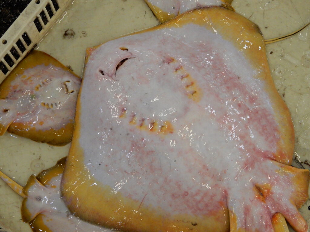 アカエイという種類で、沿岸域によくいるエイの一種です。裏返すとヒレの縁が黄色くなっているのが特徴です。堤防釣りでも釣れる種ですが、尻尾に毒針があるので要注意です。