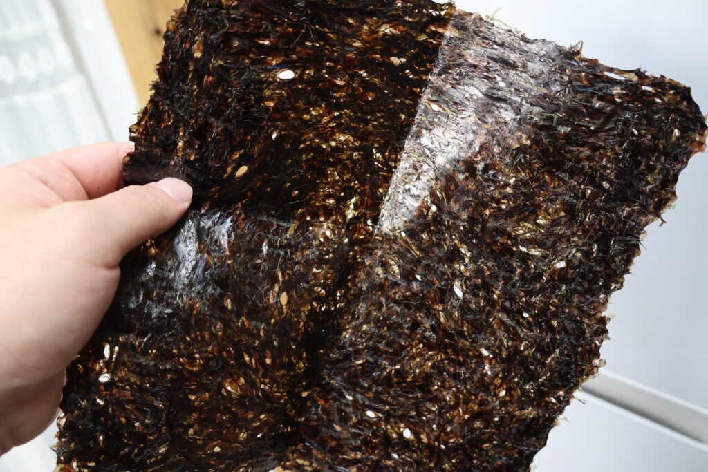 そのままでは少し茶色みのある色をしていますが、トースターなどで軽く炙ることによって緑色に変化します。これがいわゆる焼き海苔と呼ばれる状態で、炙ることで水分が飛び、パリパリになります。