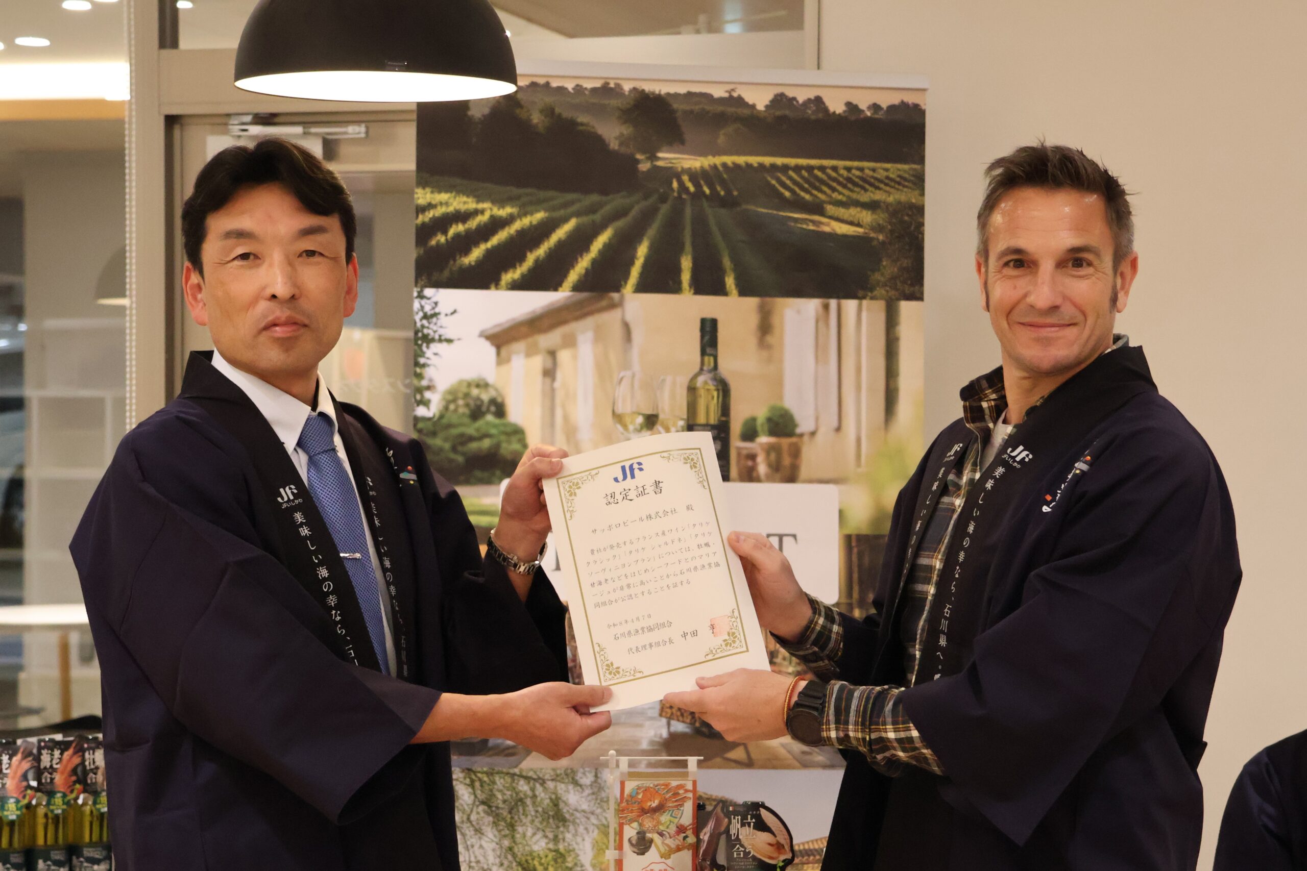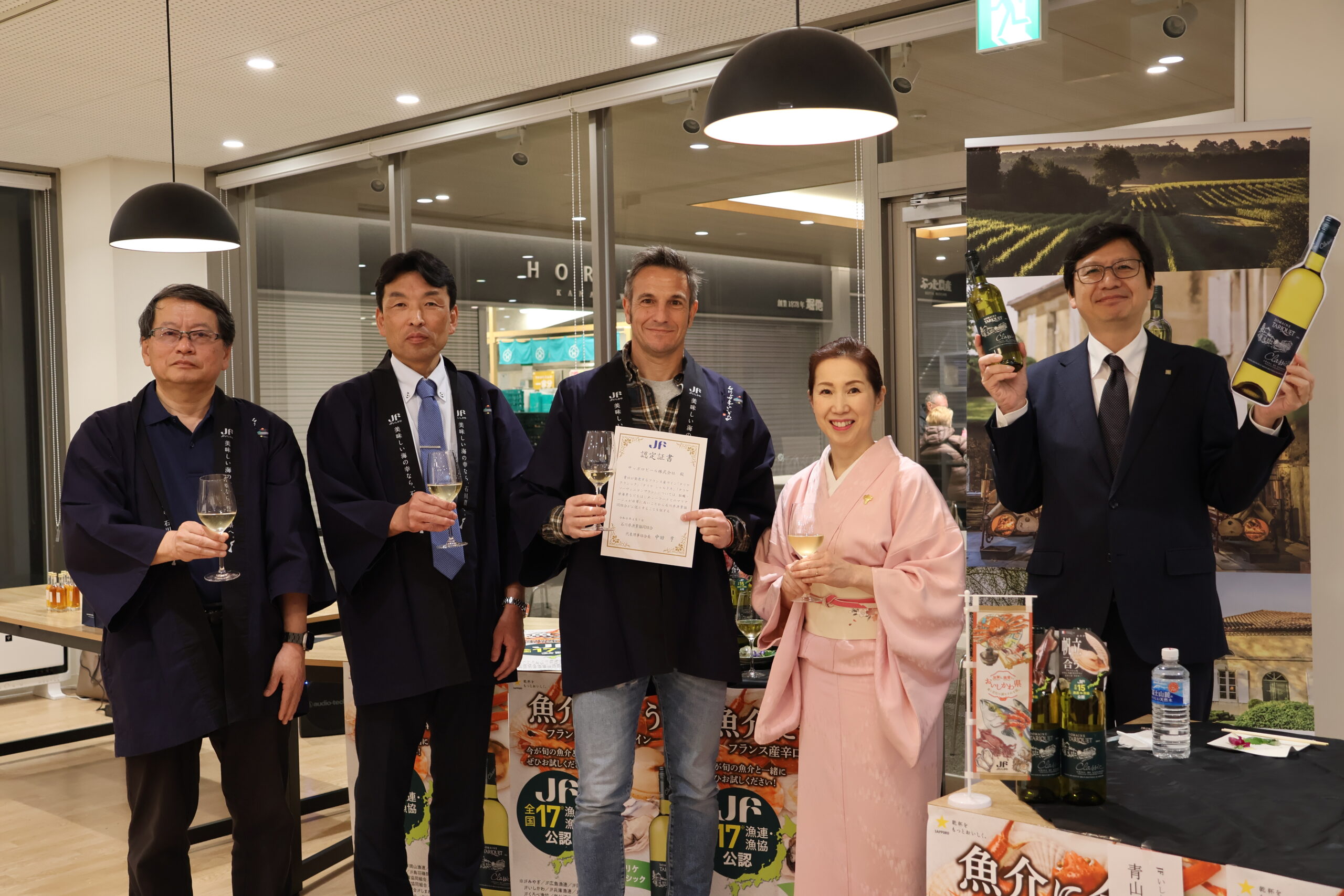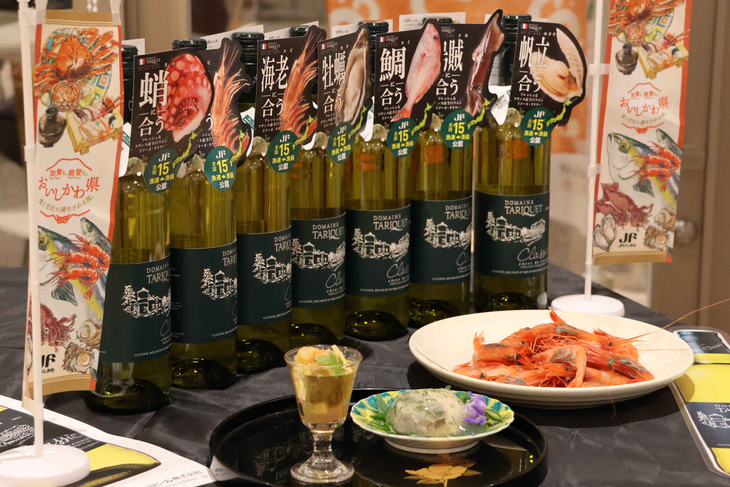 #お知らせ news フランス産ワインと石川県産サワラ・甘エビPRイベントを実施しました!2026.04.07 4いいねLoading シェア 本日、サッポロビール様と共同し、フランス産ワイン「ドメーヌ・タリケ」と石川県産サワラ・甘エビのPRイベントを行いました。併せて、JFいしかわから「魚介に合うワイン」としての認定書を贈呈しました。 料理研究家しもおきひろこ先生には、タリケに合うサワラと甘エビのレシピを考案していただき、タリケ醸造家のアルミンさんからも”パーフェクト”と好評でした。 売り場で見つけたら、ぜひ魚介とのマリアージュを試してみてください! 2026.04.07